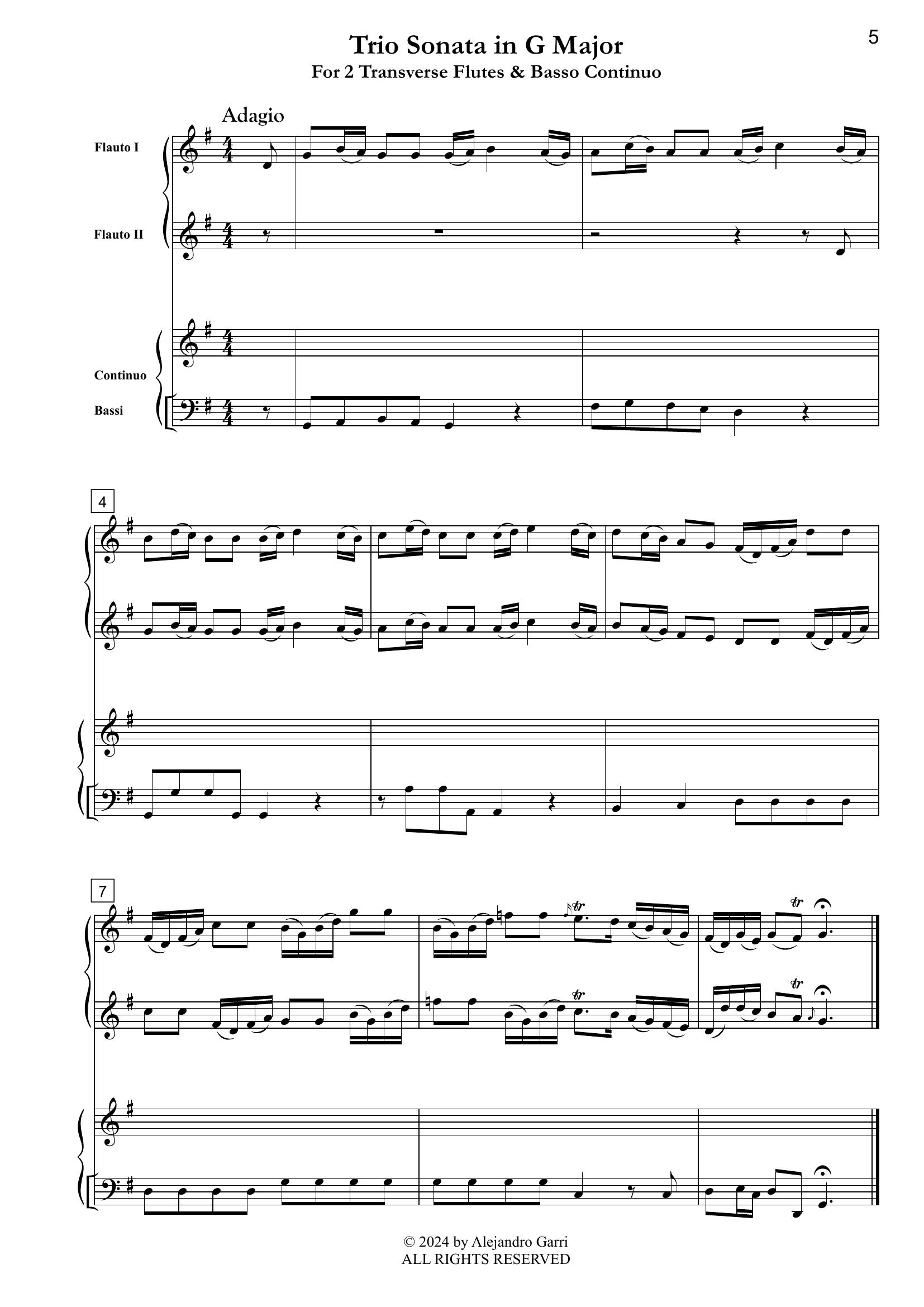 Mancini, Francesco (1672 – 1737) Trio Sonata in G Major, for 2 Transverse Flutes & Basso Continuo (full score & 3 parts)
