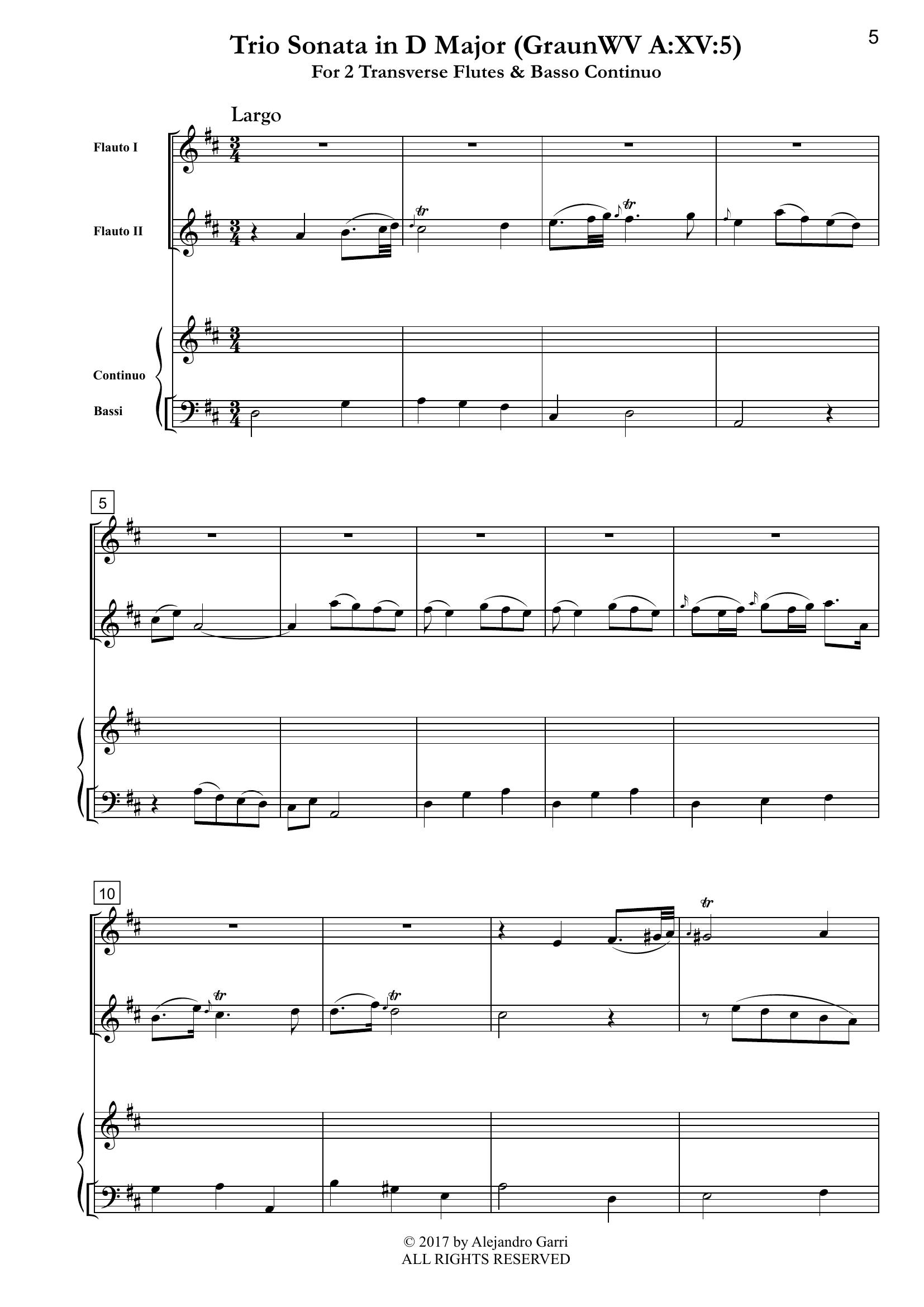 Graun, Johann Gottlieb (1702/03 – 1771) Trio Sonata in G Major (GraunWV A:XV:5) for 2 Transverse Flutes & Basso Continuo (full score & 3 parts)