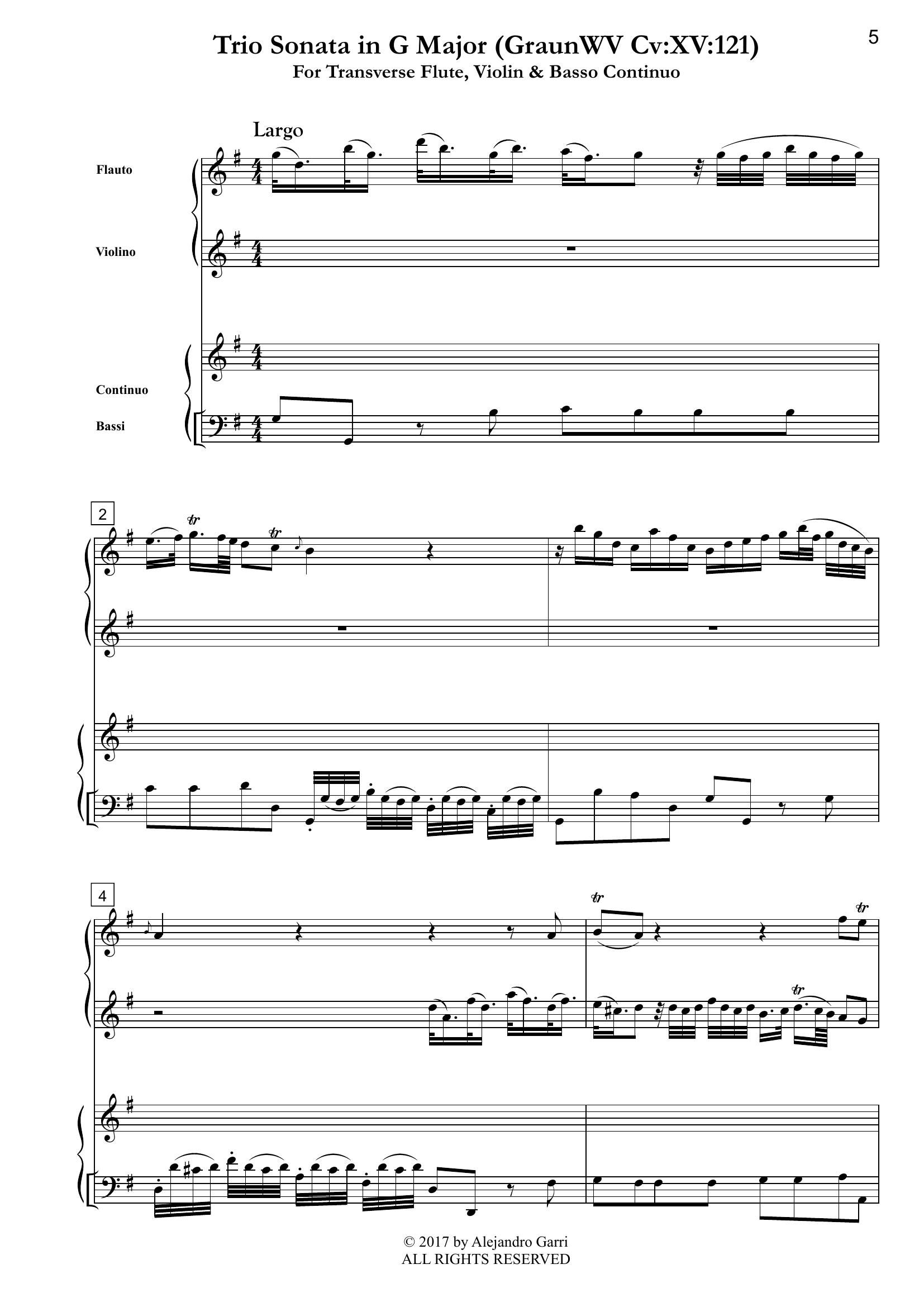 Graun, Johann Gottlieb (1702/03 – 1771) Trio Sonata in G Major (GraunWV Cv:XV:121), for Transverse Flute, Violin & Basso Continuo (full score & 3 parts)