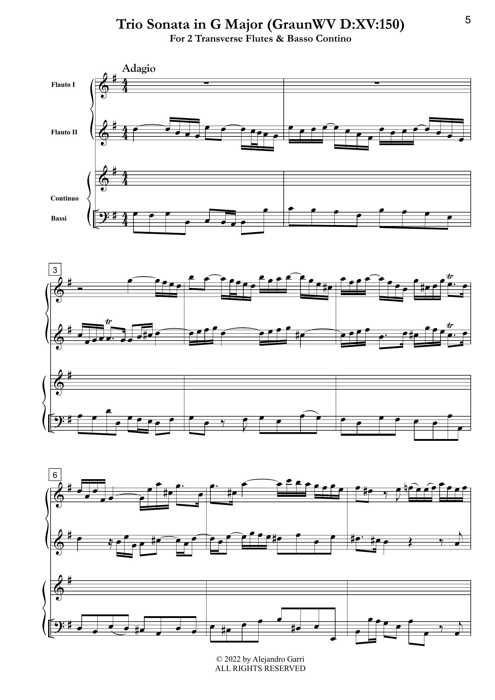 Graun, Carl Heinrich (1703/04-1759) Trio Sonata in G Major (GraunWV D:XV:150), for 2 Transverse Flutes & Basso Continuo (full score & 3 parts)