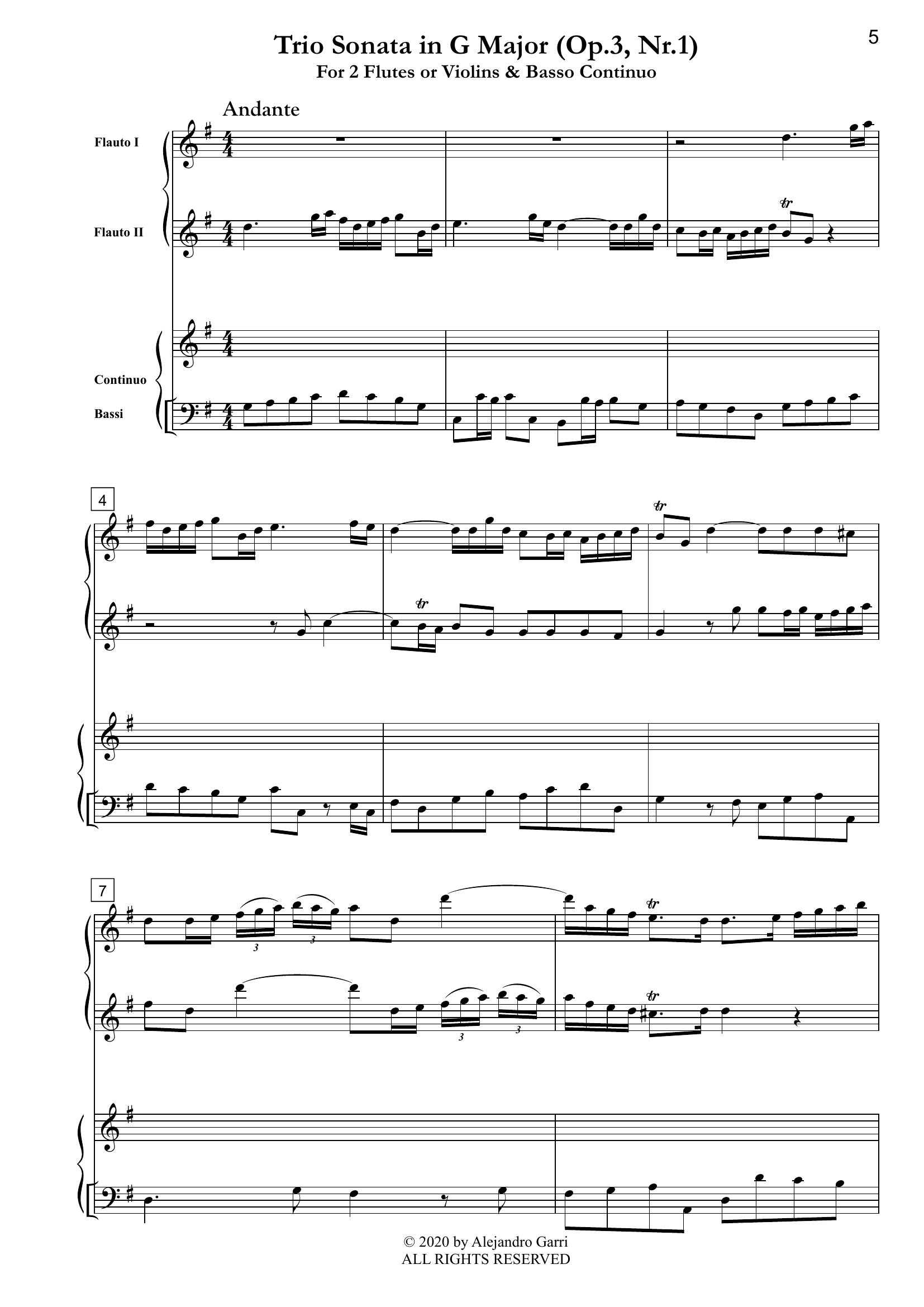 Quantz, Johann Joachim (1697 – 1773) Trio Sonata in G Major (Op.3, Nr.1), for 2 Flutes or Violins & Basso Continuo (full score & 3 parts)