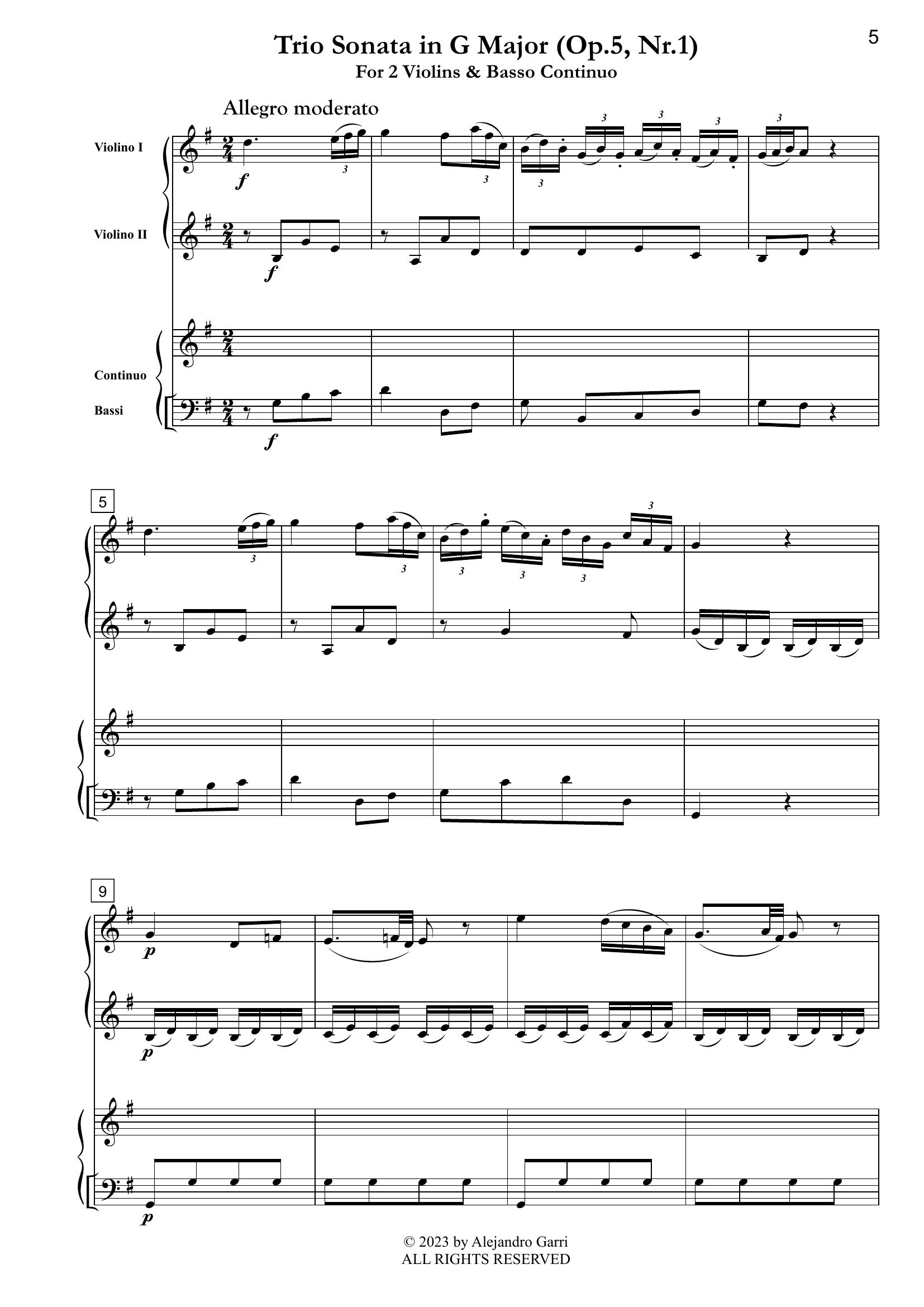 Vanhal, Johann Baptist (1739 – 1813) Trio Sonata in G Major (Op.5, Nr.1), for 2 Violins & Basso Continuo (full score & 3 parts)