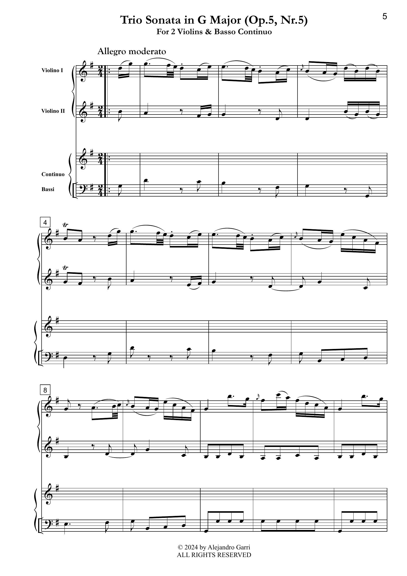 Vanhal, Johann Baptist (1739 – 1813) Trio Sonata in G Major (Op.5, Nr.5), for 2 Violins & Basso Continuo (full score & 3 parts)