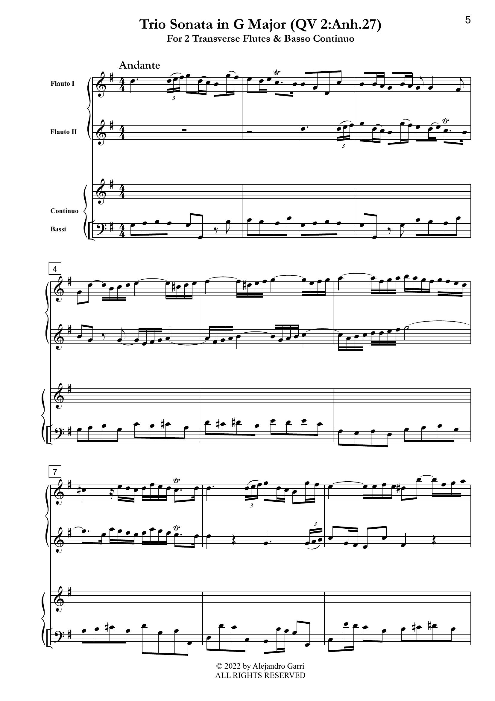 Quantz, Johann Joachim (1697 – 1773) Trio Sonata in G Major (QV 2:Anh.27), for 2 Transverse Flutes & Basso Continuo (full score & 3 parts)