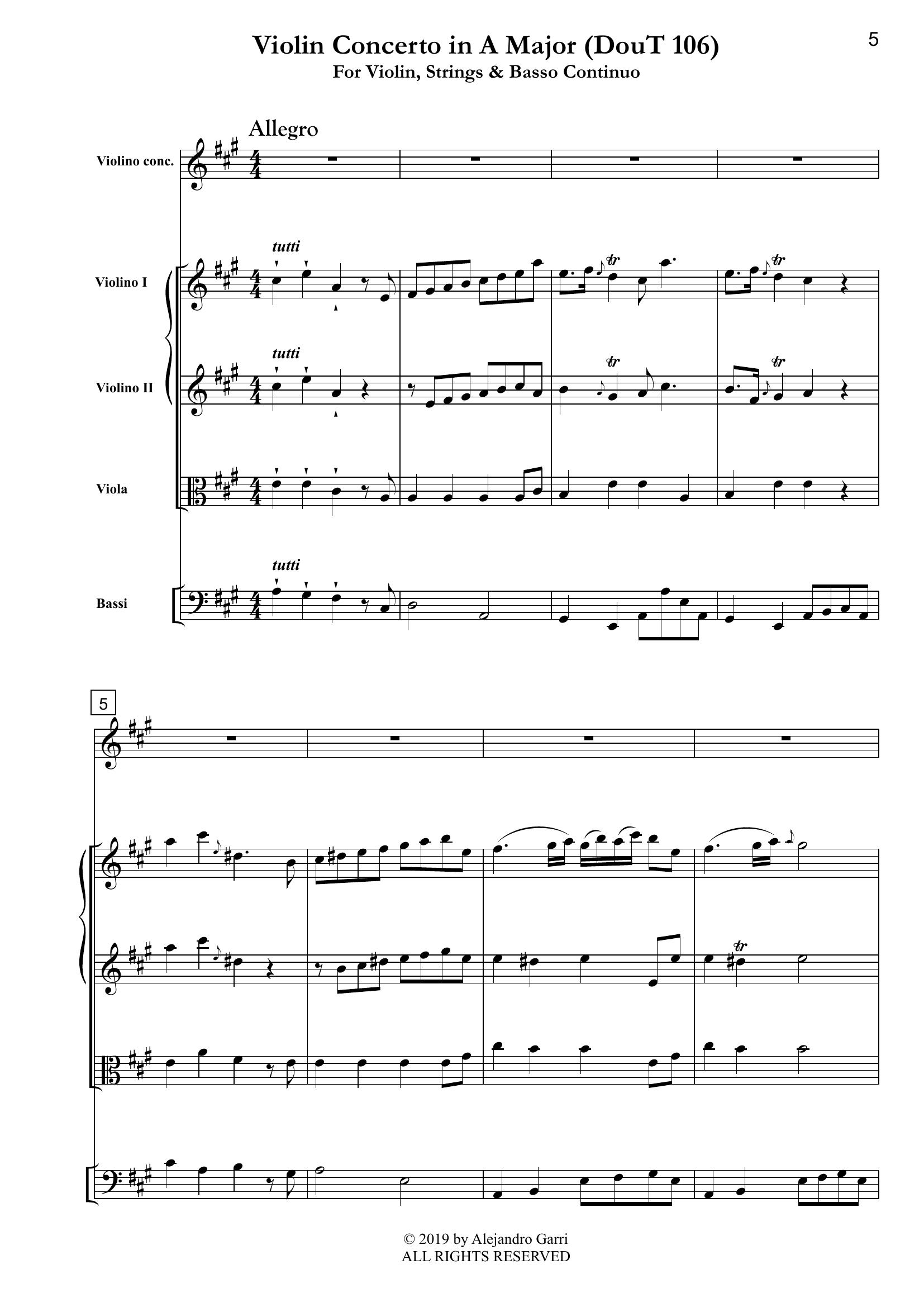 Tartini, Giuseppe (1692 – 1770) Violin Concerto in A Major (DouT 106), for Violin, Strings & Basso Continuo (full score & 5 parts)