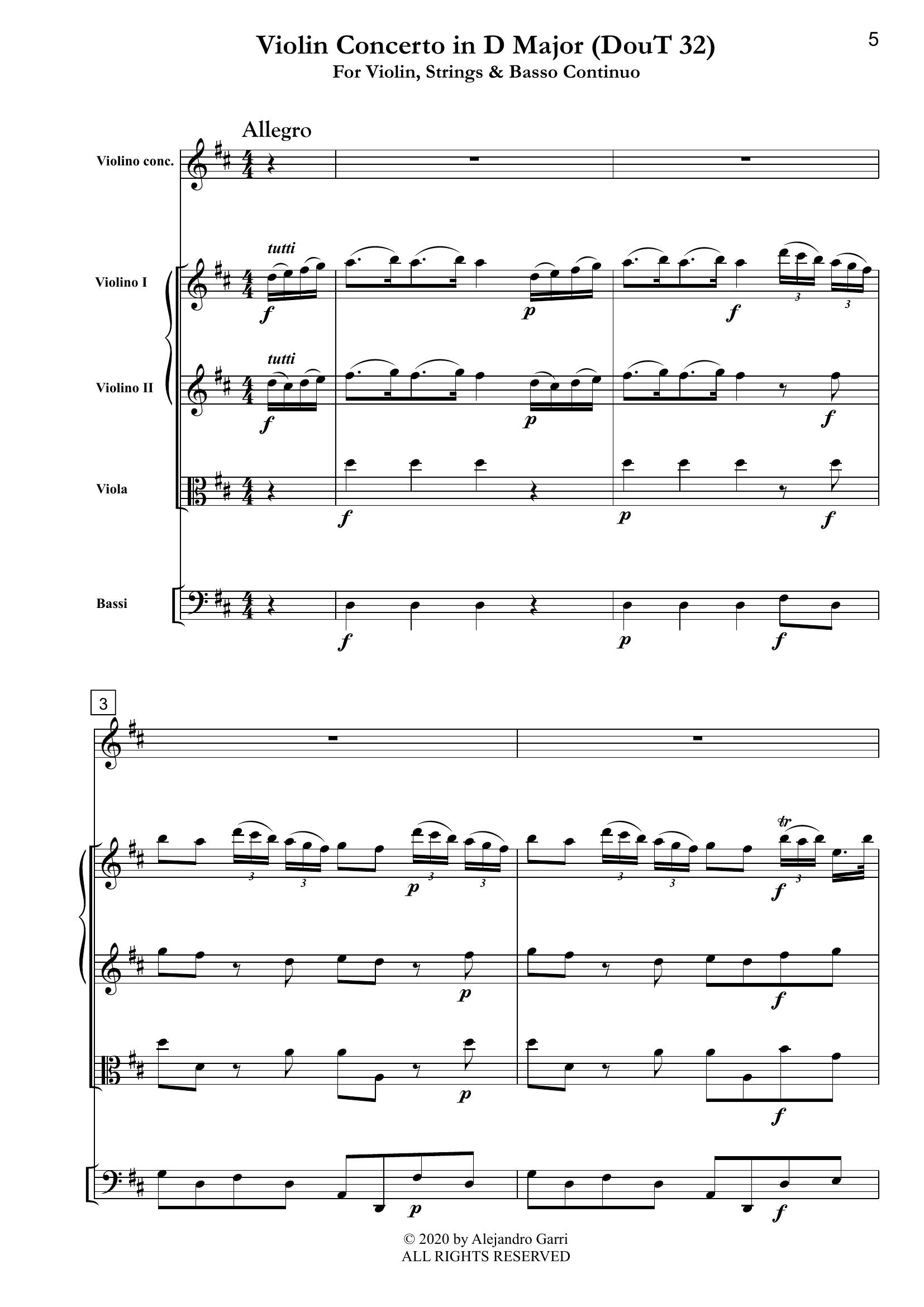 Tartini, Giuseppe (1692 – 1770) Violin Concerto in D Major (DouT 32), for Violin, Strings & Basso Continuo (full score & 5 parts)