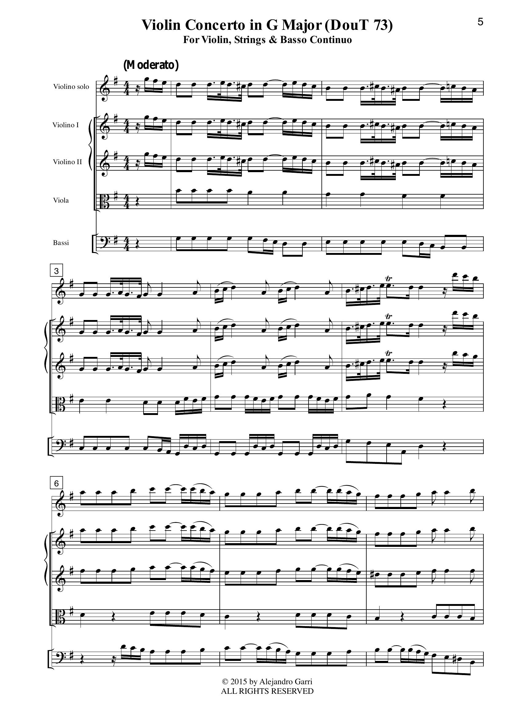 Tartini, Giuseppe (1692 – 1770) Violin Concerto in G Major (DouT 73), for Violin Solo, Strings & Basso Continuo (full score & 5 parts)
