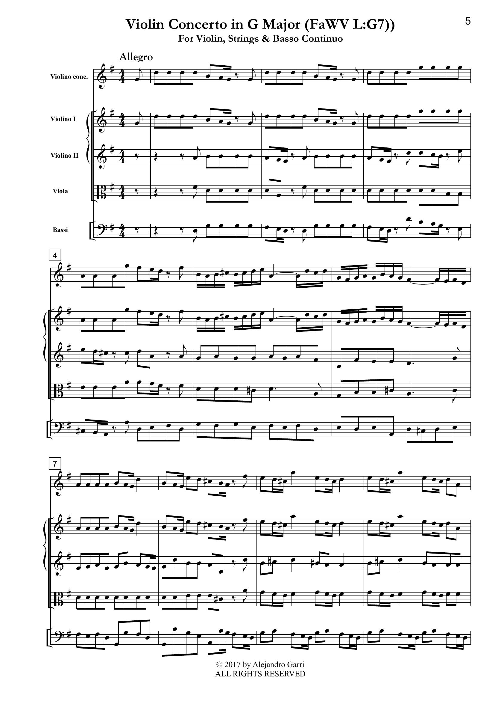 Fasch, Johann Fr. (1688 -1758) Violin Concerto in G Major (FaWV L:G7), for Violin, Strings & Basso Continuo (full score & 5 parts)