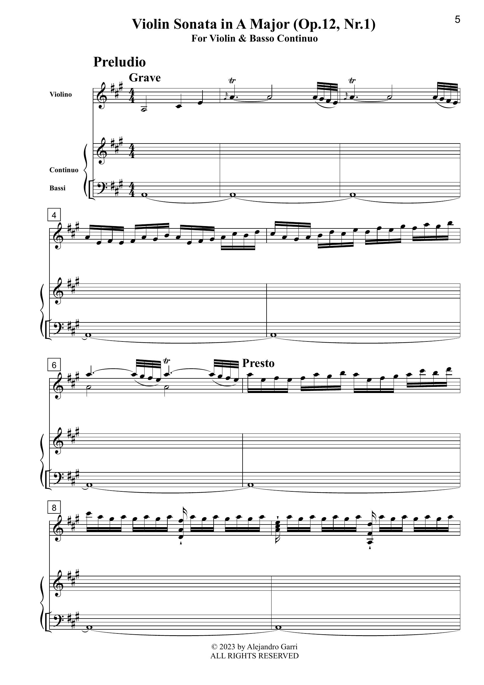 Porpora, Nicola (1686 – 1768) Violin Sonata in A Major (Op.12. Nr.1) for Violin & Basso Continuo (Full Score & 2 Parts)